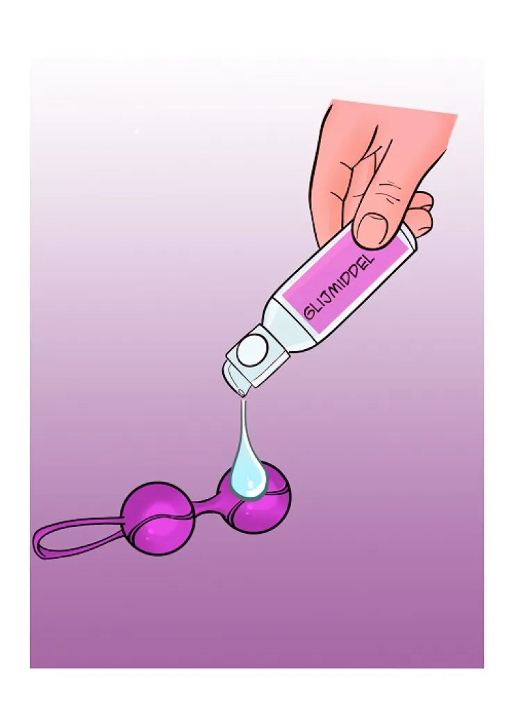 Voordat u het balletje of balletjes inbrengt, breng eerst een beetje glijmiddel aan op het voorste balletje. Dat maakt het inbrengen een stuk comfortabeler. Breng niet teveel aan, want dat kan het balletje te glad worden en glijdt het balletje er te gemakkelijk uit.
