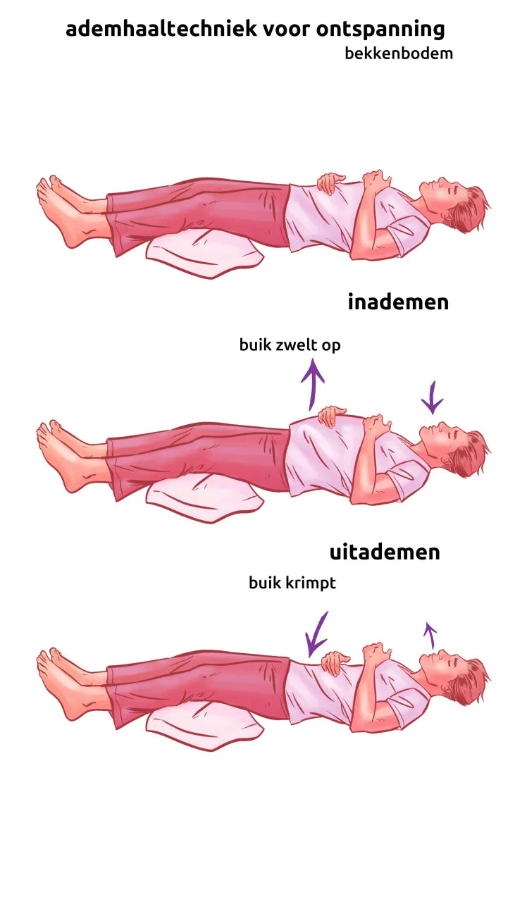 Bij mannen en vrouwen met een gespannen bekkenbodem zit de ademhaling vaak te hoog. Ze ademen vanuit de borst. Dat is een manier van ademhaling bij stress, angst of gespannenheid. Voor ontspanning moet u laag ademen, vanuit uw (onder)buik. Het is belangrijk om ontspannen te leren ademhalen.