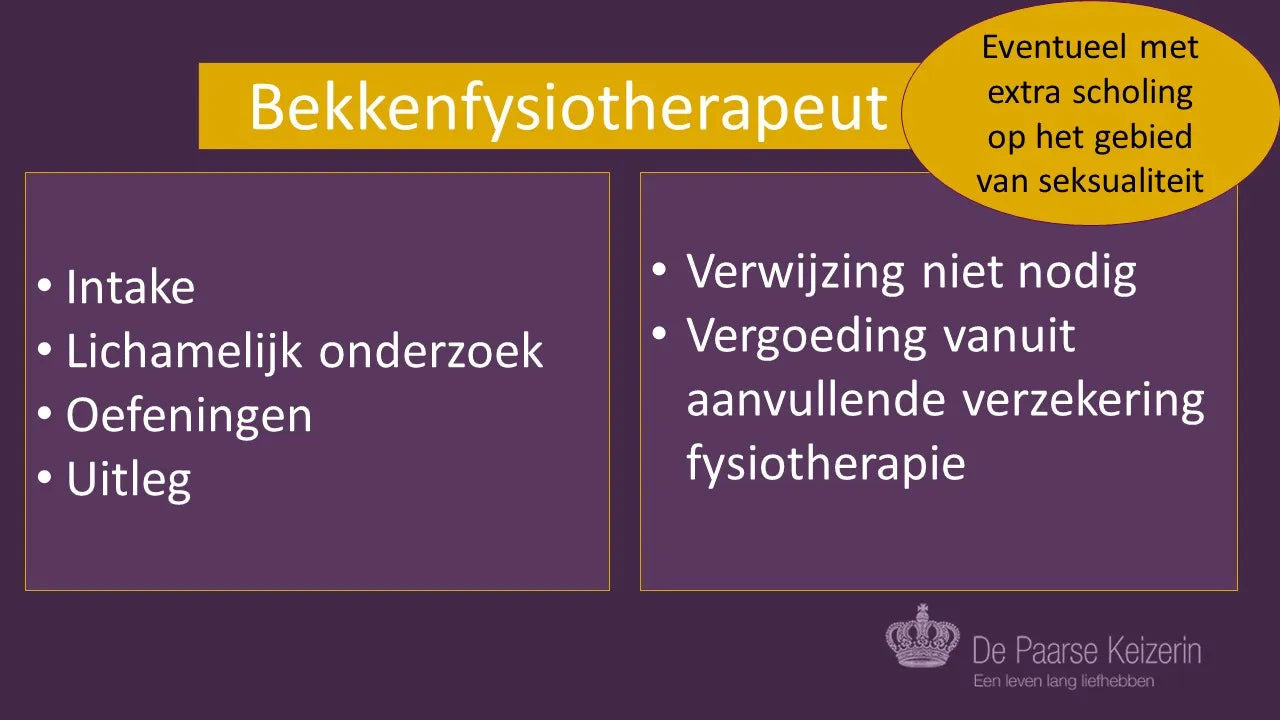 Bekkenfysiotherapeuten hebben geen scholing gehad in seksuele klachten, tenzij ze hier later aanvullende scholing voor volgen. Wij adviseren daarom een bekkenfysiotherapeut met extra scholing te zoeken.