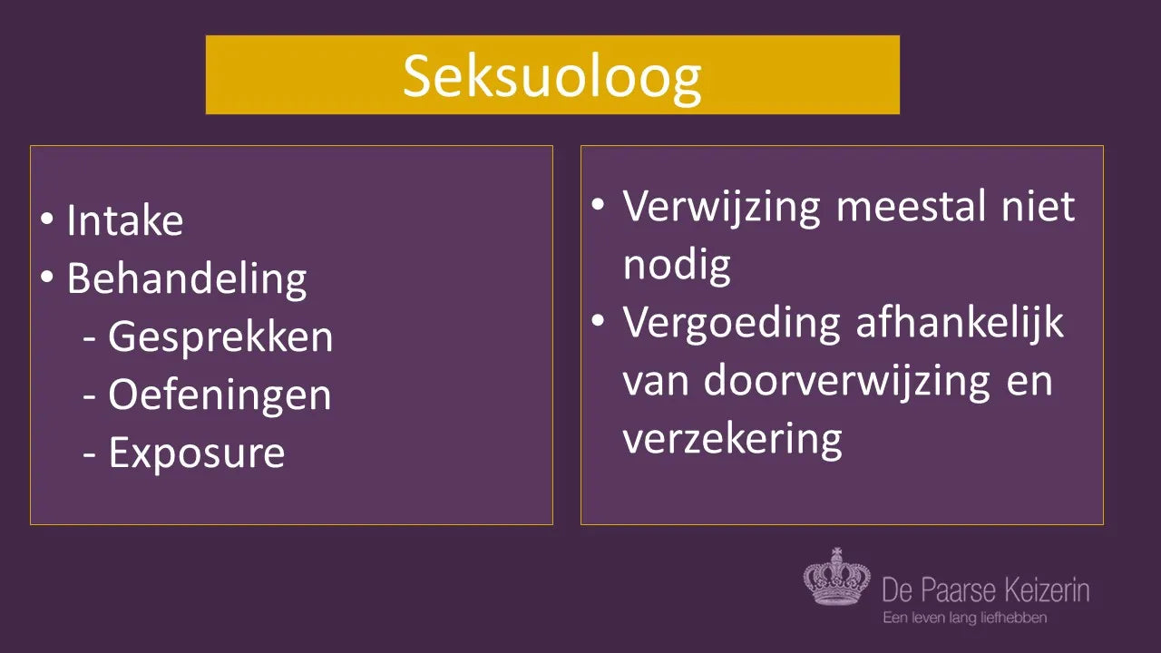 Arts-seksuologen mogen lichamelijke onderzoeken uitvoeren en exposurebehandelingen geven (waarbij u samen inwendige oefeningen doet). Psycholoog-seksuologen richten zich meer op gesprekken en psychologische aspecten. Beide hebben dezelfde seksuologie-opleiding gevolgd en kunnen effectief helpen.