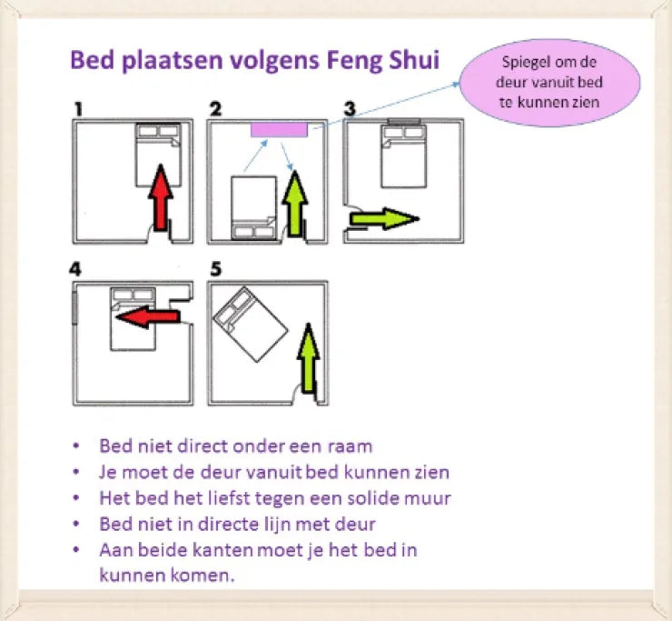Volgens Feng Shui mag een spiegel niet recht tegenover het bed hangen. Dit weerkaatst energie en kan onrust veroorzaken. Plaats spiegels zo dat u uzelf niet ziet liggen vanuit bed.