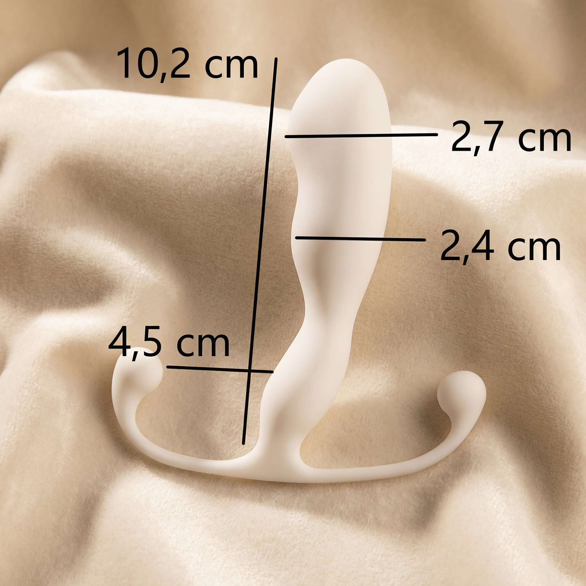 De Aneros Helix Trident heeft een totale lengte van ongeveer 22,5 cm, inclusief het handvat en de uitstekende armen aan de buitenkant. Het inbrengende gedeelte is aanzienlijk korter. De breedte van de verpakking is 14 cm en de dikte van het product is 3,5 cm. Deze afmetingen maken de Helix Trident een compact en niet-intimiderend model, juist geschikt voor wie nog weinig ervaring heeft met prostaat massagers.