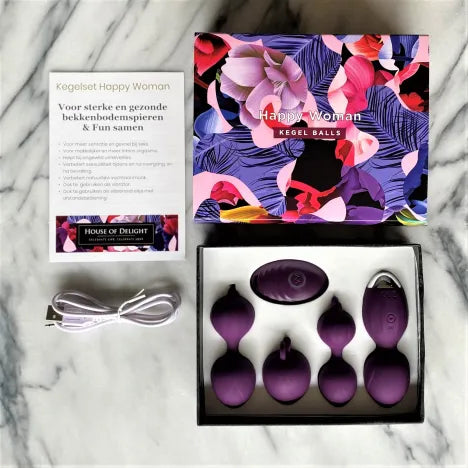 De Happy Woman kegelset is niet alleen een slimme manier om uw bekkenbodemspieren te versterken, het is ook een verrassend leuke. Deze set combineert functionaliteit met speelsheid en bevat:
