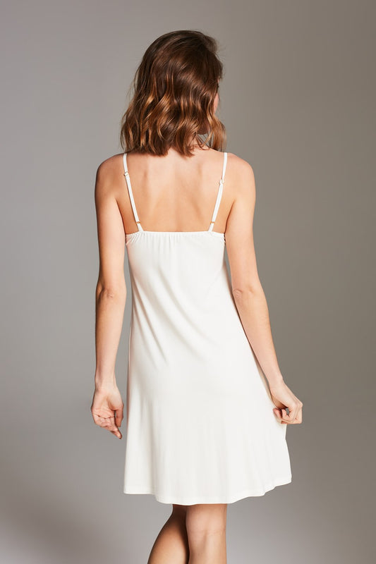 Het nachthemdje is gemaakt van een mix van 93% viscose en 7% elastan. De viscose wordt geproduceerd uit houtpulp en korte katoenvezels, wat resulteert in een zachte, ademende stof. Het elastan zorgt voor een lichte stretch, waardoor het jurkje comfortabel zit zonder te knellen.